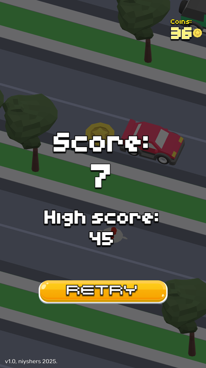 A silly joke that has been known since childhood. Inspired by Crossy Road, this game is made using GDevelop... well by made, I mean I just straight up used a template in the engine and created this game. I did changed things here and there though to learn how the engine works and what it is capable of.